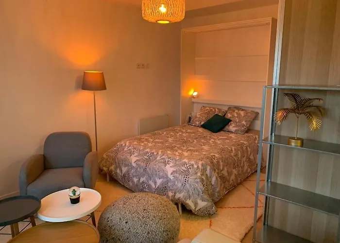 A tengerparti Studio De Charme Sous Les Pins Au Calme Apartman apartman 5 percnyi vezetésre van az Esplanade Benoît területétől. Ez az 1 hálószobás apartman tartalmaz mikrohullámú sütőt és hűtőt a konyhában.